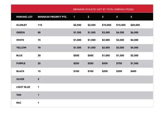 Season parking passes are only available to season ticket holders on Busch and Livingston campus. You are eligible for 1 parking pass for every 4 season tickets you purchase. You can either call us at 866-445-GORU or add on parking when you check out your season tickets online. For new season ticket holders, you can elect to purchase a parking pass for $140 (minimum parking pass price) at the time of purchase. Beginning July 8th, season ticket holders will be able to select their lot in priority point order, availability and qualifications met for each lot. Further information regarding minimum priority point and annual giving requirements for parking process will be provided after your order. Click Here to view our game day parking map and policies.